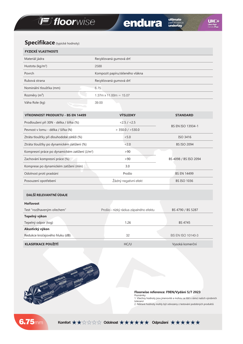 Prémiová podložka FLOORWISE ENDURA je vyrobena z drcené gumy, lze ji pokládat do prostor s podlahovým vytápěním. Zvuková izolace ∆Lw dosahuje hodnoty 32 dB.