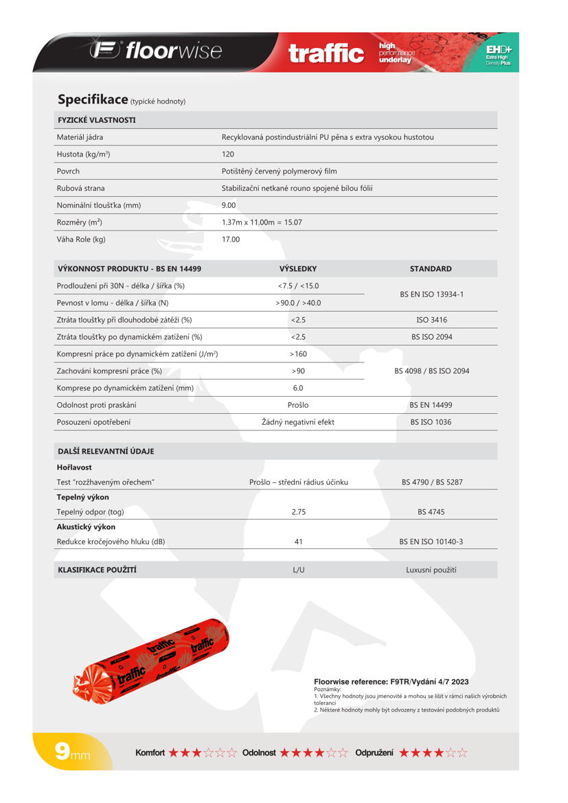 Spodní vrstva je laminována netkaným rounem, podložka FLOORWISE TRAFFIC je vyrobena z recyklované polyuretanové pěny. Ta se vyrábí výrobním procesem za užití tlaku a tepla, kterými je recyklovaný materiál slisován dohromady, a vytváří tak hustou, pružnou a lehkou podložku. Jádro z této pěny dosahuje velmi vysoké hustoty, a to celých 120 kg/m3, zvuková izolace ∆Lw pak dosahuje hodnoty 41 dB. Jedná se tedy o opravdu luxusní, kvalitní a po všech stránkách poctivý a do detailů propracovaný výrobek, který po pokládce vnese Vašemu interiéru doslova nový rozměr komfortu a užívání.