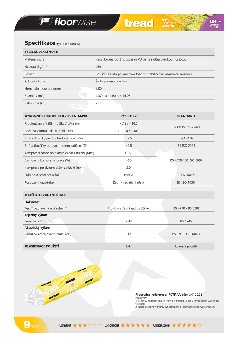 Podložka FLOORWISE TREAD je vyrobena z recyklované polyuretanové pěny. Ta se vyrábí výrobním procesem za užití tlaku a tepla, kterými je recyklovaný materiál slisován dohromady, a vytváří tak hustou, pružnou a lehkou podložku. Jádro z této pěny dosahuje velmi vysoké hustoty, a to celých 180 kg/m3, zvuková izolace ∆Lw pak dosahuje hodnoty 39 dB. Spodní vrstva je opatřena žlutým polyethylenovým filmem. Jedná se tedy o opravdu luxusní, kvalitní a po všech stránkách poctivý a do detailů propracovaný výrobek, který po pokládce vnese Vašemu interiéru doslova nový rozměr komfortu a užívání.
