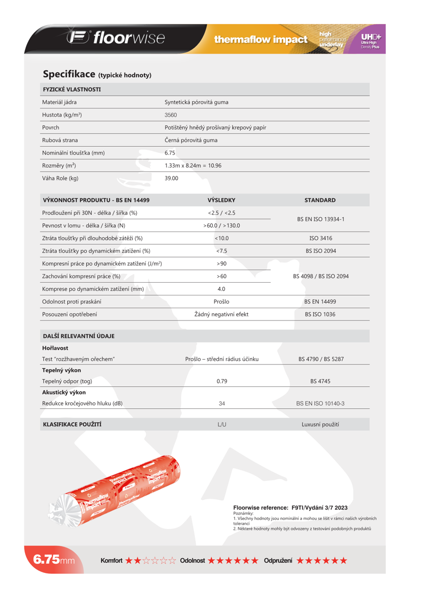 Podložka FLOORWISE THERMAFLOW IMPACT je vyrobena ze syntetické gumy s velmi nízkým tepelným odporem, tento materiál zaručuje efektivní prostup tepla z podlahového vytápění. Zvuková izolace ∆Lw dosahuje hodnoty 34 dB. Jedná se tedy o opravdu luxusní, kvalitní a po všech stránkách poctivý a do detailů propracovaný výrobek, který po pokládce vnese Vašemu interiéru doslova nový rozměr komfortu a užívání.