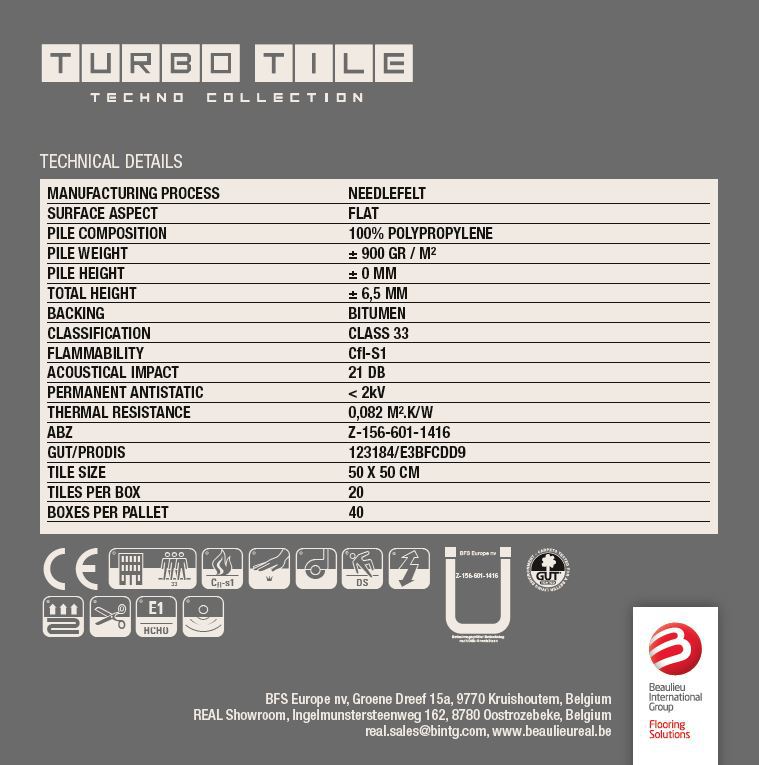 Vpichovaná polypropylenová vlákna potěší nenáročností na údržbu. Podklad tvoří pevný bitumen, který činí koberec ještě odolnějším. Kobercové čtverce Turbo můžete umístit do frekventovaných zón, jsou vhodné ke stálému používání kolečkových židlí, tlumí kročejový hluk a lze je položit i do prostor s podlahovým vytápěním.